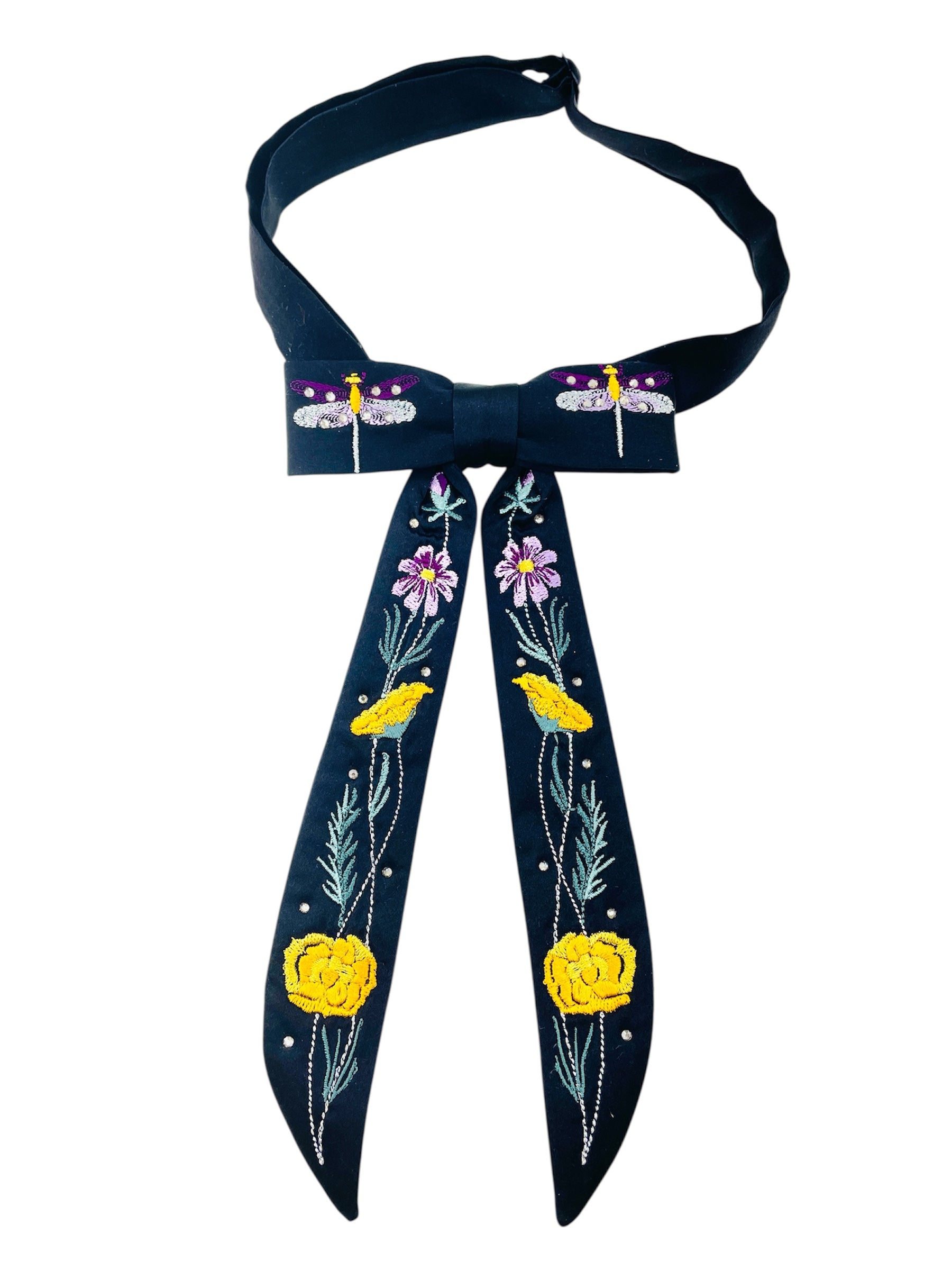 Western clip tie featuring birthday botanicals. Each tie features a glass gemstone at the center, with an option of gold or silver plate finish. The clip tie is constructed from medium weight silk with machine embroidery & glass rhinestones.