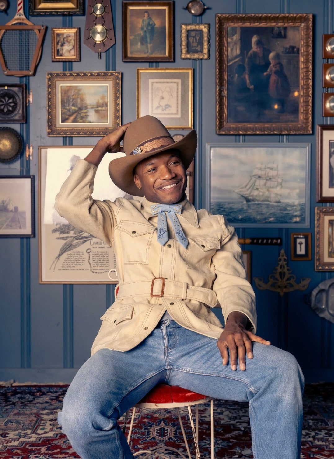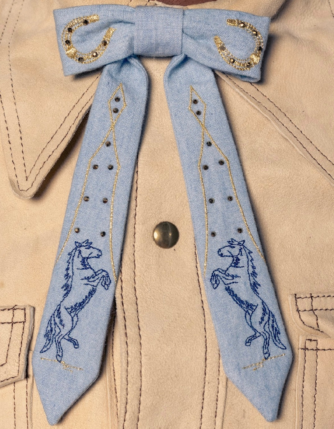 Western clip tie featuring lucky horse shoes & rearing horses. Tie features glass rhinestones & gold thread machine embroidery.