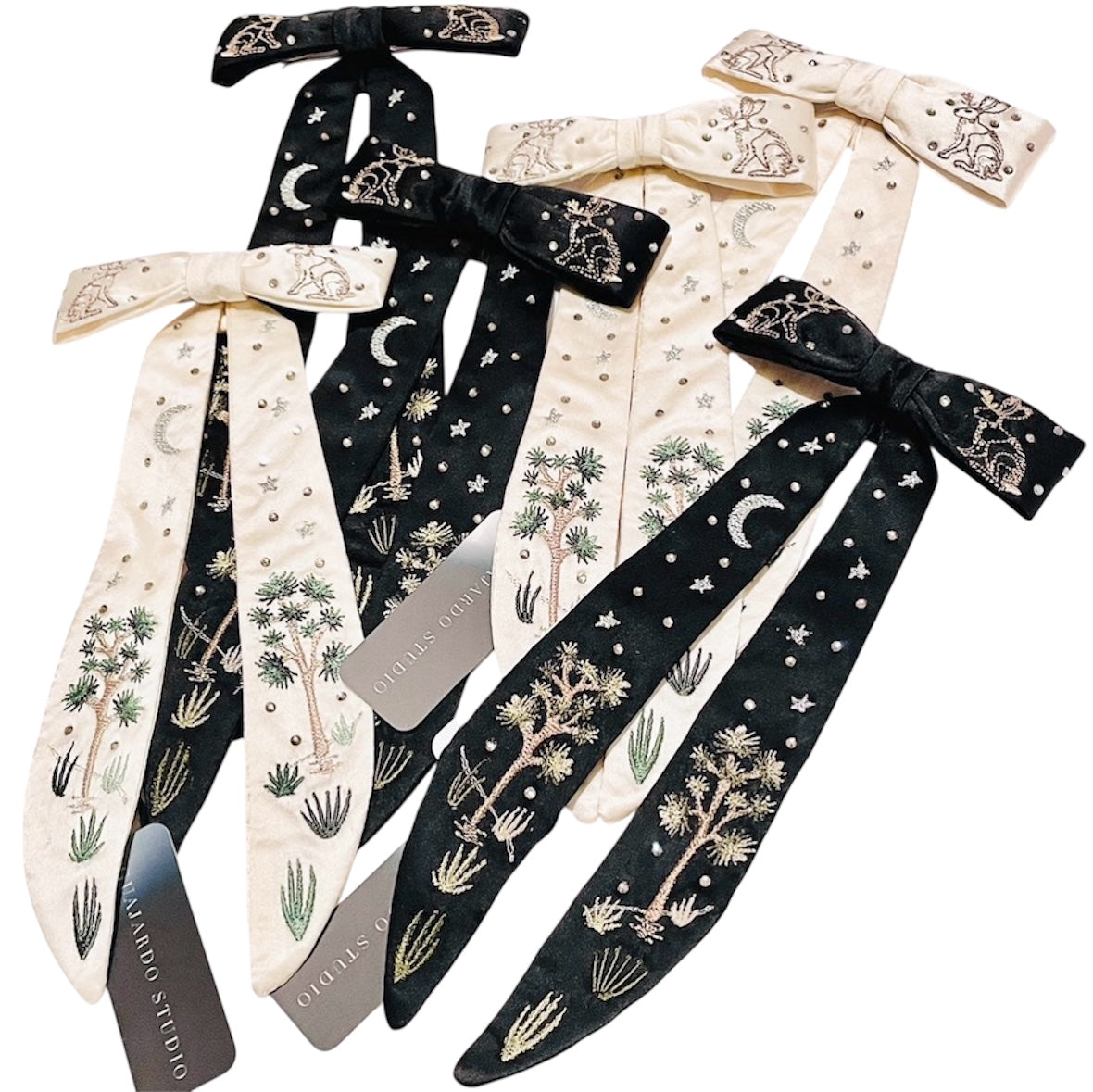 Western clip tie featuring plants and creatures of the Mojave Desert. The clip tie is constructed from medium weight silk with machine embroidery & glass rhinestones.